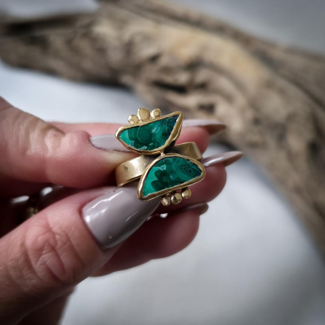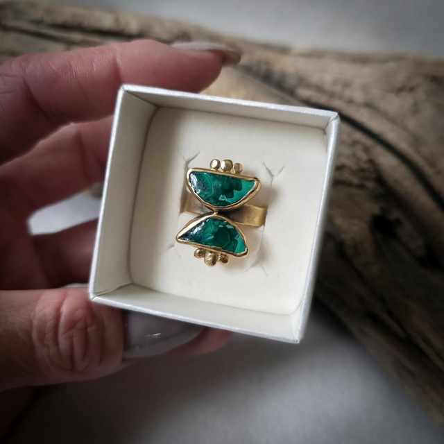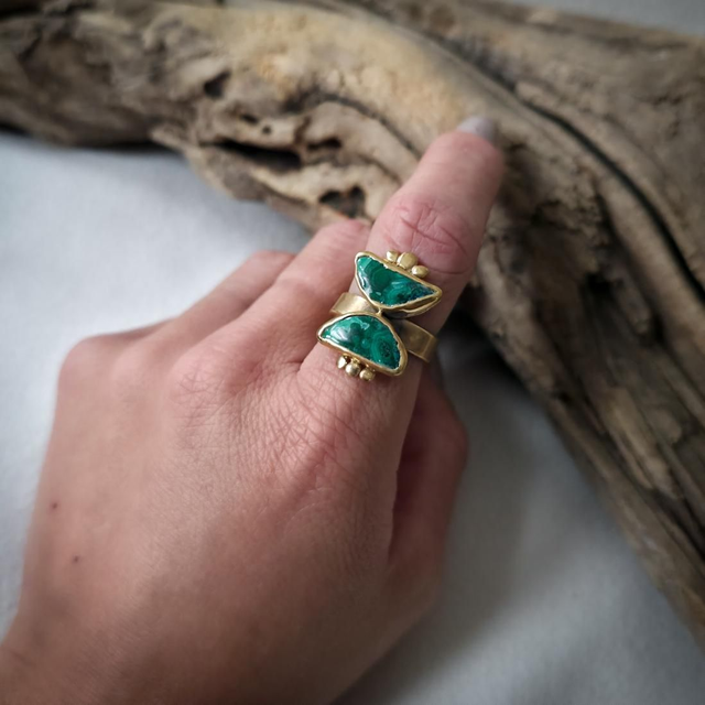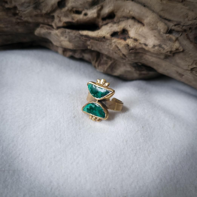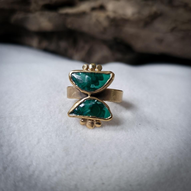 As duas malaquites com inclusões de crisocola, colocadas em forma de ampulheta, unem o verde da cura e da expansão com o azul da comunicação emocional. Juntas, estas pedras simbolizam a alquimia entre passado e futuro, céu e terra, emoção e consciência, guiando a transformação com presença e intenção.