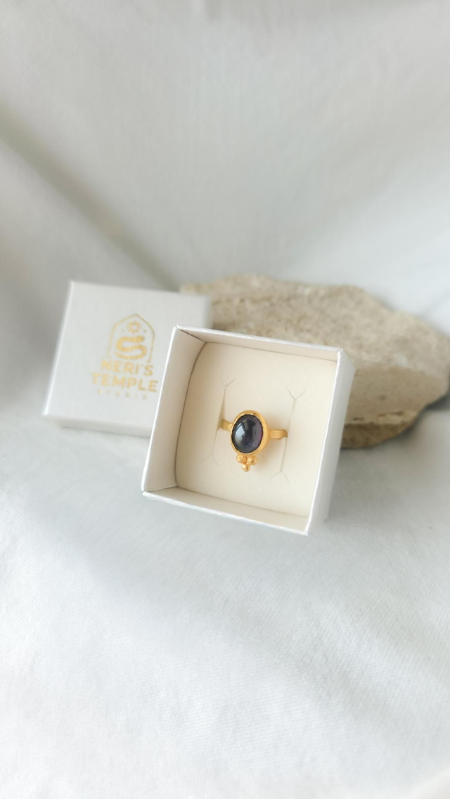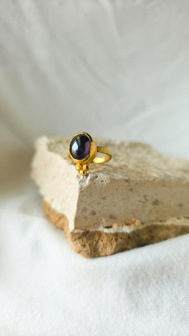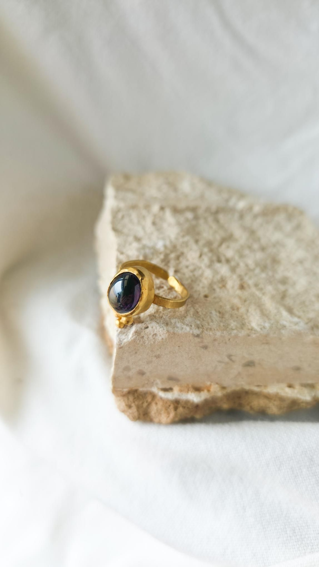 Anel ajustável artesanal feito em latão plaqueado a ouro de 24k, com uma ametista em cabochão. O metal preserva texturas orgânicas e formas naturais, oferecendo um acabamento único e com presença. O design ajustável adapta-se confortavelmente a diferentes tamanhos, mantendo a força e a sofisticação da peça.