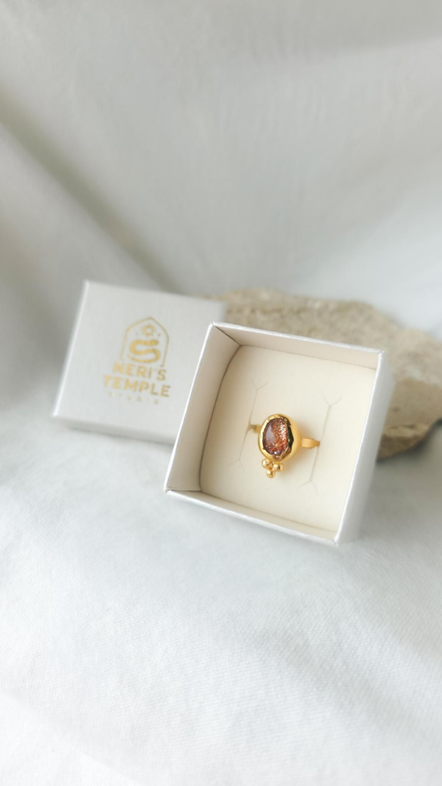 Anel ajustável artesanal feito em latão plaqueado a ouro de 24k, com uma pedra do sol. O metal preserva texturas orgânicas e formas naturais, conferindo um acabamento elegante e com presença. O design ajustável adapta-se confortavelmente a diferentes tamanhos, mantendo a força e a sofisticação da peça.