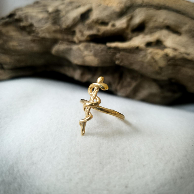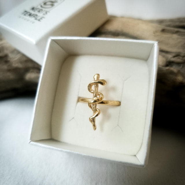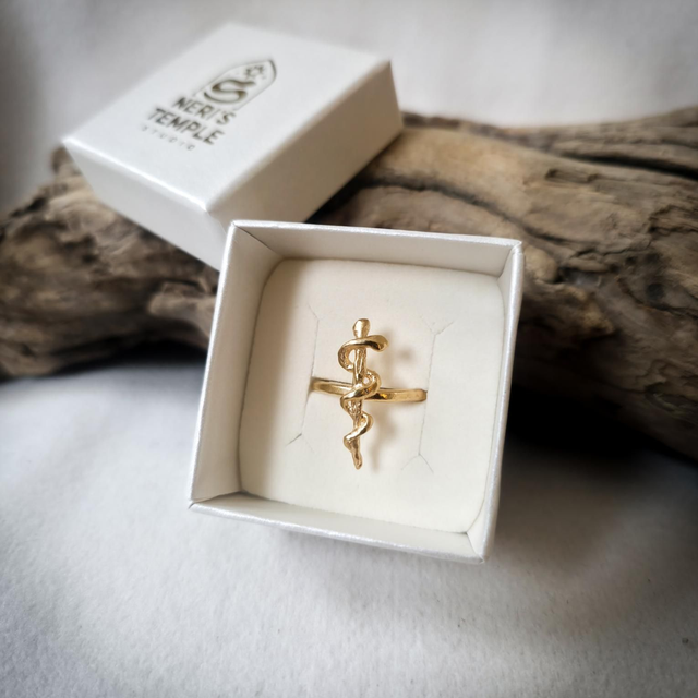 O Anel Mulher-Medicina é um talismã poderoso, pensado para mulheres que investem na sua própria cura e na cura dos outros. No seu centro, o símbolo do Bastão de Asclépio evoca a medicina ancestral, a sabedoria do cuidado e a energia transformadora da cura.