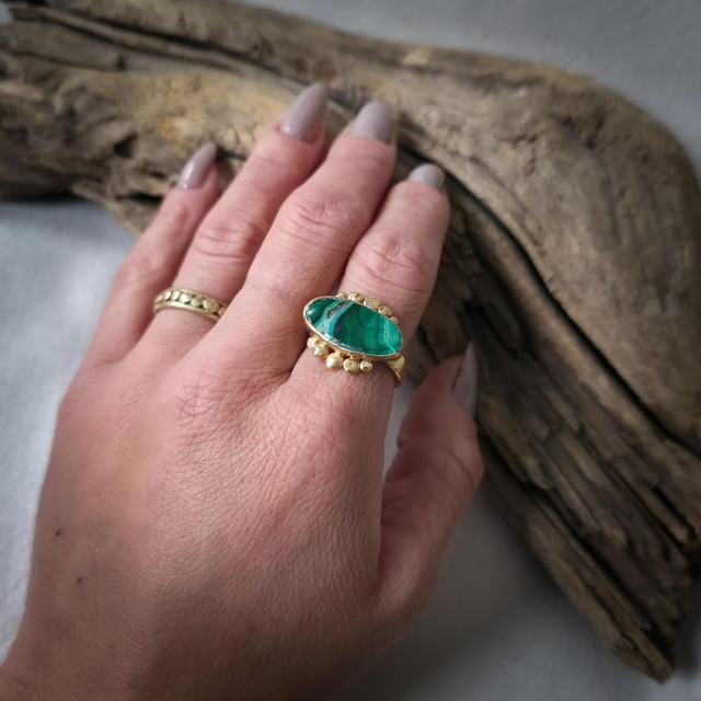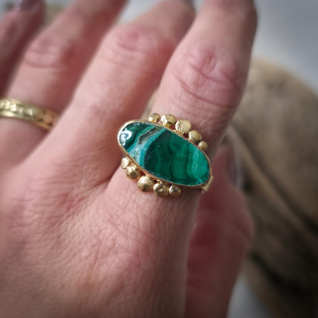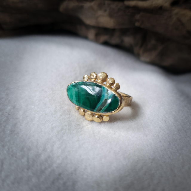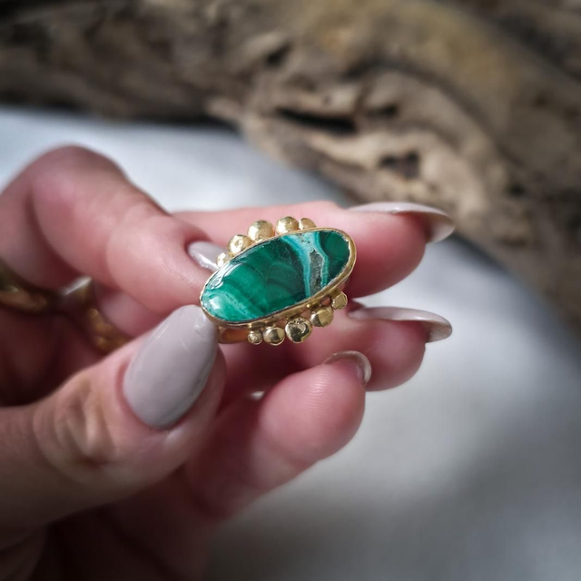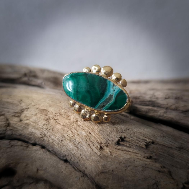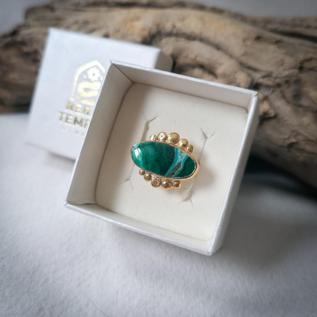No centro, a malaquite com inclusões de crisocola, pedra de alquimia profunda, une o verde da cura e da expansão com o azul da comunicação emocional. Associada à transformação consciente, à abertura do coração e à expressão autêntica do sentir, esta pedra assume aqui a forma de olho, símbolo de perceção subtil, proteção energética e clareza interior.