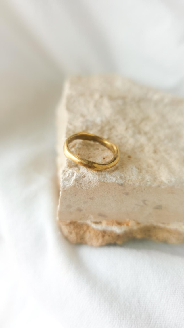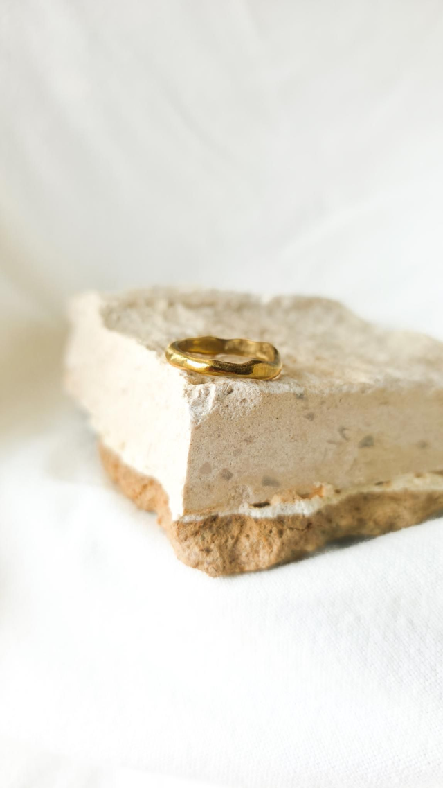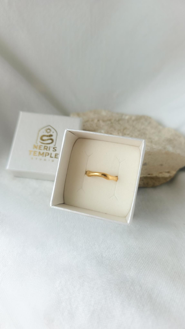 Anel simples e orgânico, feito em latão plaqueado a ouro de 24 quilates, com um acabamento suave e natural que realça as formas curvas e fluidas. A sua estética minimalista e artesanal torna-o perfeito como anel complementar, ideal para combinar com outros anéis com pedras, criando camadas elegantes e harmoniosas no dedo.