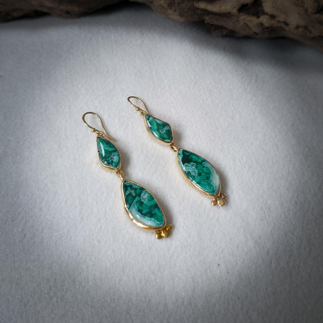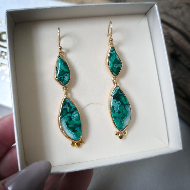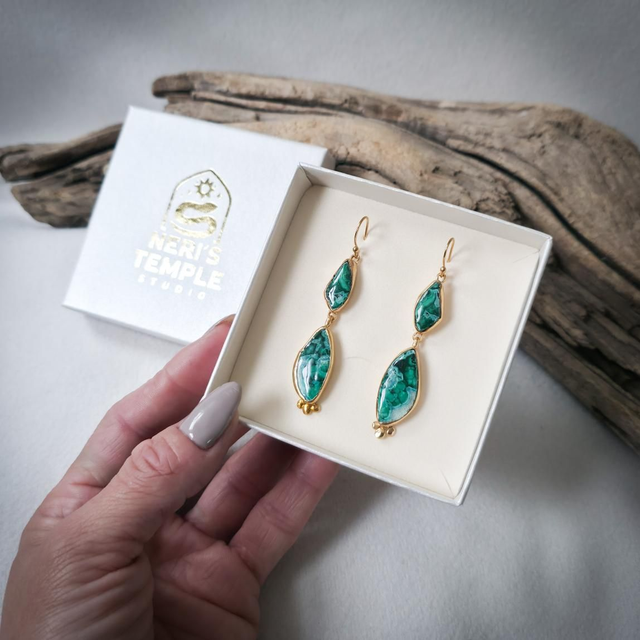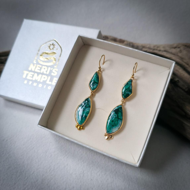 A malaquite com inclusões de crisocola é uma pedra de alquimia profunda, que une o verde da cura e da expansão com o azul da comunicação emocional. Associada à transformação consciente, à abertura do coração e à expressão autêntica do sentir, esta pedra ganha vida no balanço suave dos brincos, ativando a energia em fluxo contínuo.