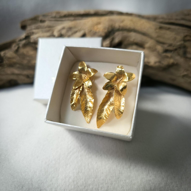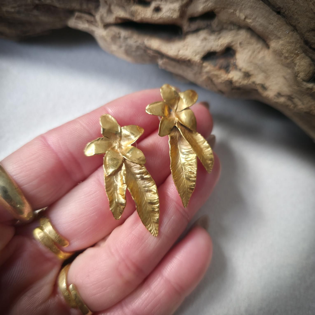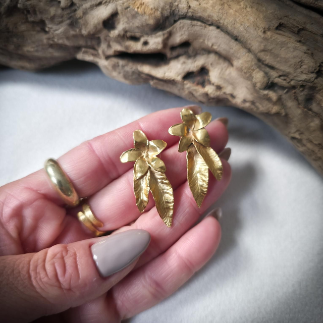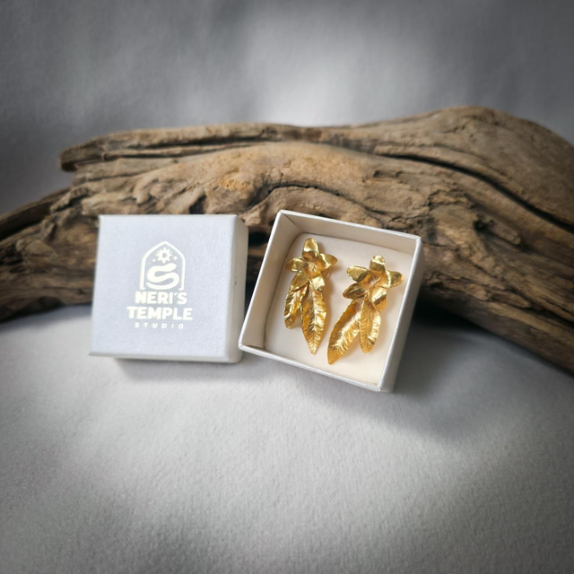 Estes brincos foram esculpidos em latão plaquado a ouro 24K, e têm o palitinho em prata 925 para minimizar o risco de alergias, unindo conforto e proteção.