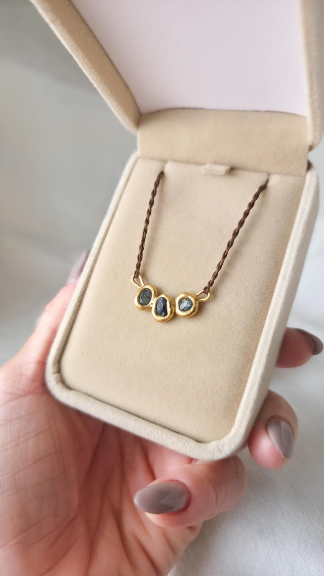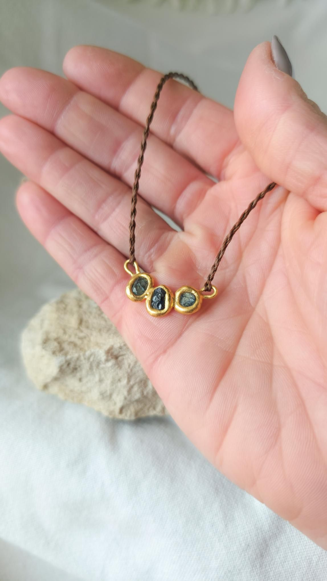 Colar artesanal feito em latão plaqueado a ouro de 24k, com três safiras azuis em bruto, criado através de um processo ancestral de forja direta no fogo. As pedras são fixadas pelo método Molten Metal Stone Setting, no qual o metal é derretido e moldado em torno da gema ainda em estado líquido. As safiras estão entre as raras pedras naturais capazes de suportar as temperaturas extremas deste processo sem perder a sua integridade.